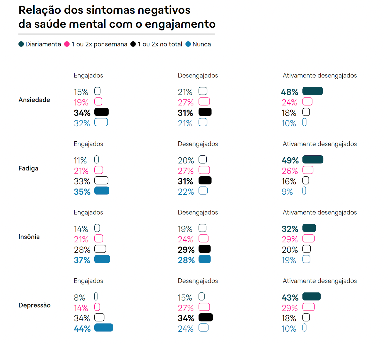 E o Engaja S/A retrata a relação direta entre o adoecimento e a motivação dos profissionais. Cinco em cada dez trabalhadores ativamente desengajados (48%) enfrentam a ansiedade todos os dias, enquanto entre os engajados este número cai para 15%.