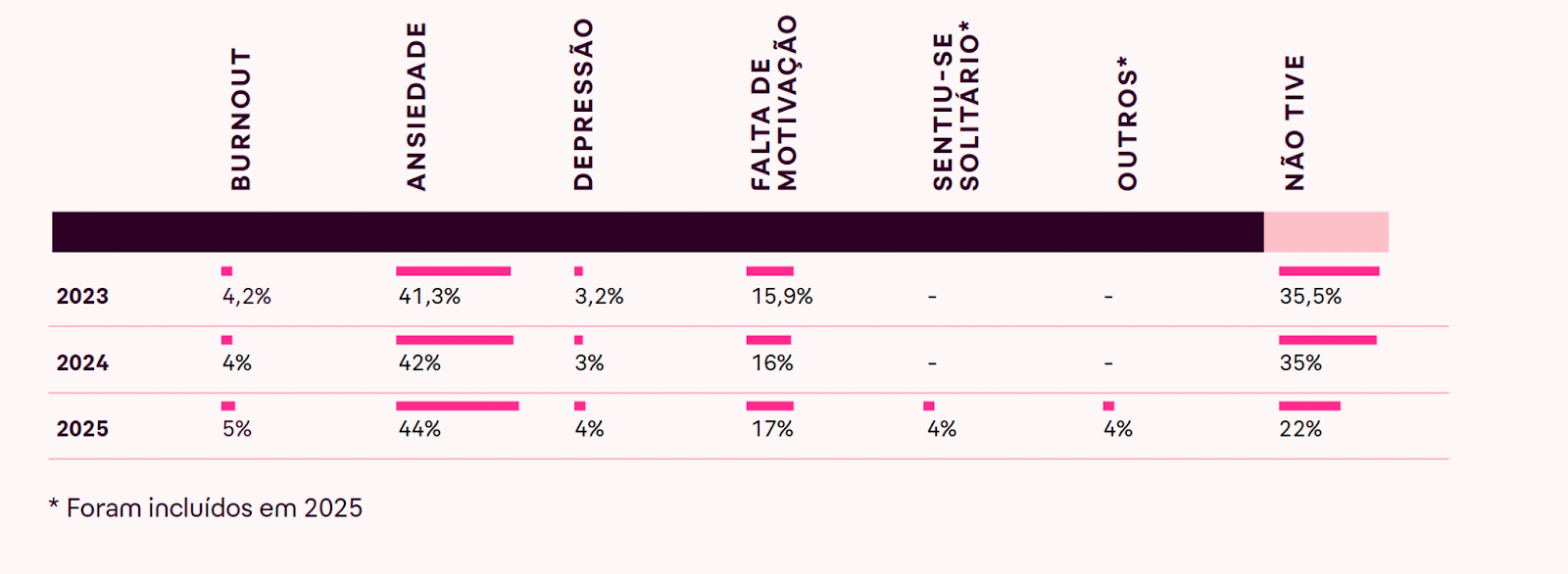 Apesar de 86% dos 774 entrevistados afirmarem reconhecer a importância da saúde mental para o desempenho corporativo, a cultura do silêncio segue ativa na posição. Nos últimos 12 meses, 27% dos líderes receberam diagnóstico de estresse, ansiedade ou burnout _o número era de 22% em 2024.